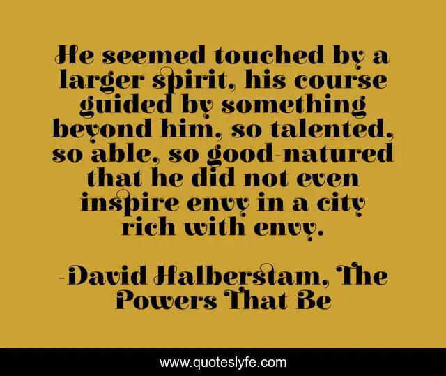 This page presents the quote "He seemed touched by a larger spirit, his course guided by something beyond him, so talented, so able, so good-natured that he did not even inspire envy in a city rich with envy.". Author of this quote is David Halberstam, The Powers That Be. This quote is about motivation, leadership, vision, inspiration,.