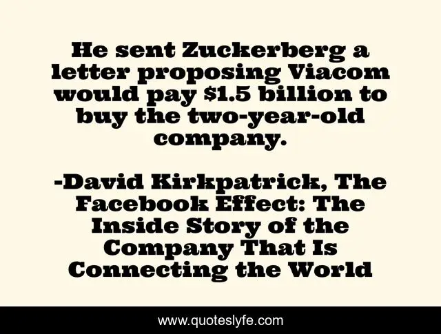 This page presents the quote "He sent Zuckerberg a letter proposing Viacom would pay $1.5 billion to buy the two-year-old company.". Author of this quote is David Kirkpatrick, The Facebook Effect: The Inside Story of the Company That Is Connecting the World. .