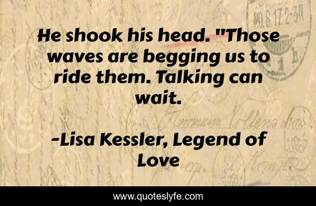 This page presents the quote "He shook his head. "Those waves are begging us to ride them. Talking can wait.". Author of this quote is Lisa Kessler, Legend of Love. This quote is about greek-mythology, paranormal-romance,.