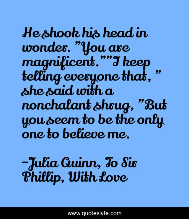This page presents the quote "He shook his head in wonder. "You are magnificent.""I keep telling everyone that, " she said with a nonchalant shrug, "But you seem to be the only one to believe me.". Author of this quote is Julia Quinn, To Sir Phillip, With Love. This quote is about love, marriage, affection, hilarious,.