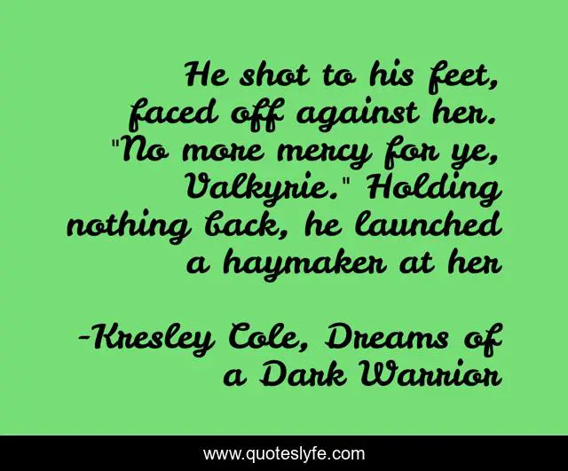 This page presents the quote "He shot to his feet, faced off against her. "No more mercy for ye, Valkyrie." Holding nothing back, he launched a haymaker at her". Author of this quote is Kresley Cole, Dreams of a Dark Warrior. This quote is about aidan-the-fierce, valkyrie, kresley-cole, regin-the-radiant, declan-chase, dreams-of-a-dark-warrior, lore, berserker, immortals-after-dark,.