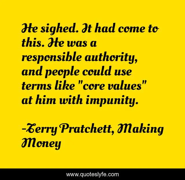 This page presents the quote "He sighed. It had come to this. He was a responsible authority, and people could use terms like "core values" at him with impunity.". Author of this quote is Terry Pratchett, Making Money. .