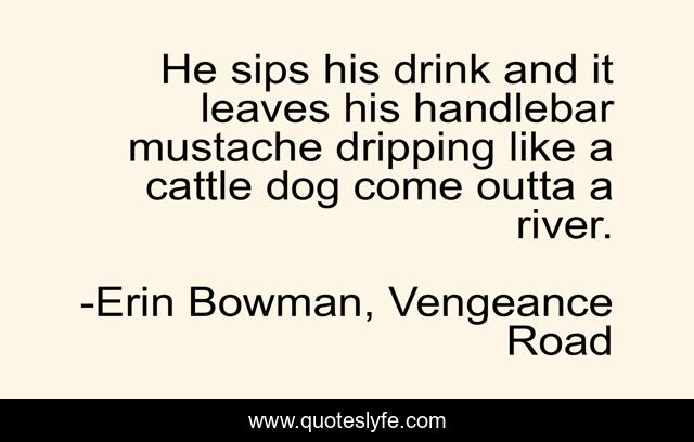 This page presents the quote "He sips his drink and it leaves his handlebar mustache dripping like a cattle dog come outta a river.". Author of this quote is Erin Bowman, Vengeance Road. This quote is about metaphor, dog, mustache, wild-west,.