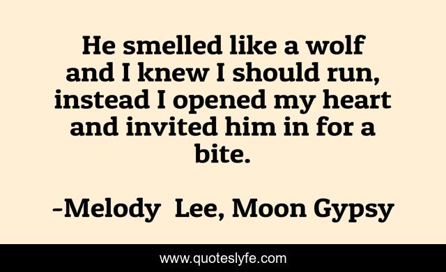 This page presents the quote "He smelled like a wolf and I knew I should run, instead I opened my heart and invited him in for a bite.". Author of this quote is Melody Lee, Moon Gypsy. This quote is about relationships, life, love, poetry, wolf, affection,.