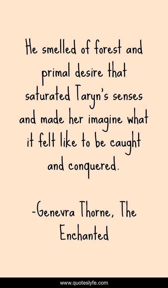 This page presents the quote "He smelled of forest and primal desire that saturated Taryn's senses and made her imagine what it felt like to be caught and conquered.". Author of this quote is Genevra Thorne, The Enchanted. This quote is about romance-love, fantasy, quotes, faerie, fairy, fae,.