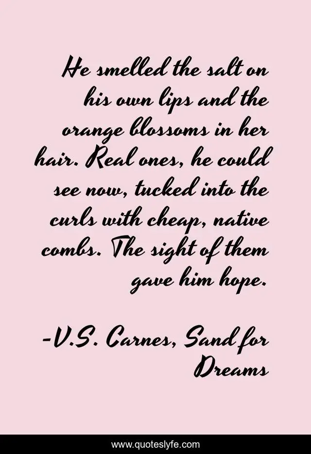 This page presents the quote "He smelled the salt on his own lips and the orange blossoms in her hair. Real ones, he could see now, tucked into the curls with cheap, native combs. The sight of them gave him hope.". Author of this quote is V.S. Carnes, Sand for Dreams. This quote is about romance, christian,.