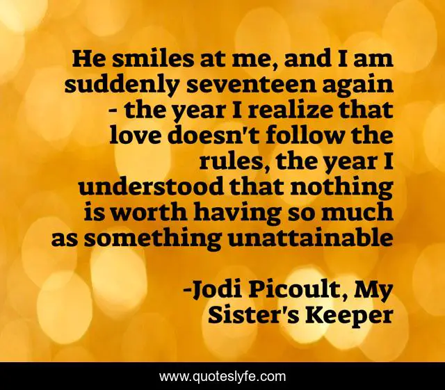 This page presents the quote "He smiles at me, and I am suddenly seventeen again - the year I realize that love doesn't follow the rules, the year I understood that nothing is worth having so much as something unattainable". Author of this quote is Jodi Picoult, My Sister's Keeper. This quote is about rules, unattainable, love, first-love, affection,.