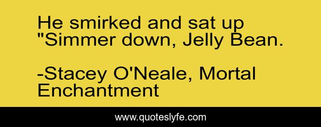 This page presents the quote "He smirked and sat up "Simmer down, Jelly Bean.". Author of this quote is Stacey O'Neale, Mortal Enchantment. This quote is about snarky, teen-fantasy, paranormal, romance, rowan, young-adult, mortal-enchantment,.