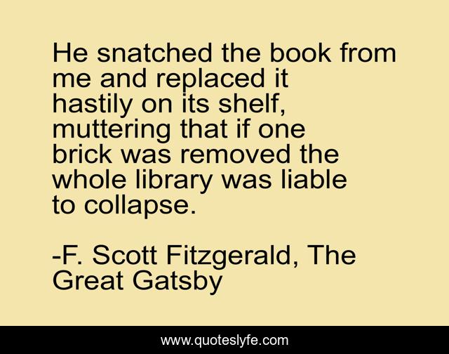 This page presents the quote "He snatched the book from me and replaced it hastily on its shelf, muttering that if one brick was removed the whole library was liable to collapse.". Author of this quote is F. Scott Fitzgerald, The Great Gatsby. .