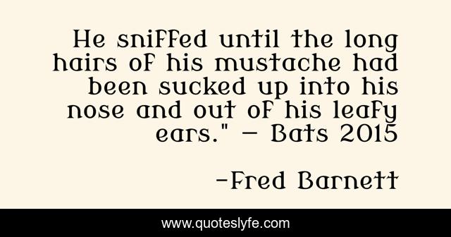 This page presents the quote "He sniffed until the long hairs of his mustache had been sucked up into his nose and out of his leafy ears." — Bats 2015". Author of this quote is Fred Barnett. This quote is about bats, vampires,.