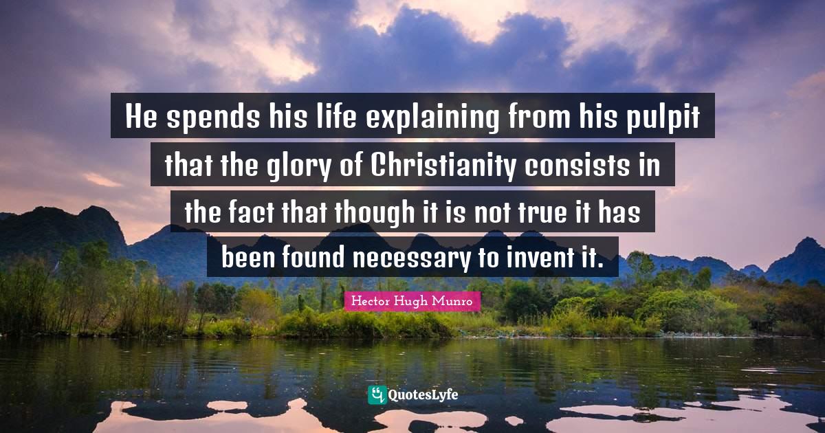 This page presents the quote "He spends his life explaining from his pulpit that the glory of Christianity consists in the fact that though it is not true it has been found necessary to invent it.". Author of this quote is Hector Hugh Munro. This quote is about pulpit, christian, facts, found, explaining, life, christianity, glory,.