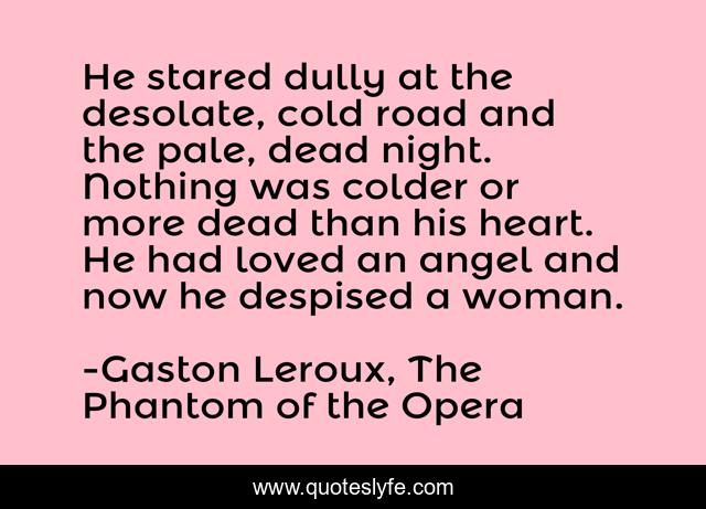 This page presents the quote "He stared dully at the desolate, cold road and the pale, dead night. Nothing was colder or more dead than his heart. He had loved an angel and now he despised a woman.". Author of this quote is Gaston Leroux, The Phantom of the Opera. This quote is about hate, despise, coldness, love, affection,.