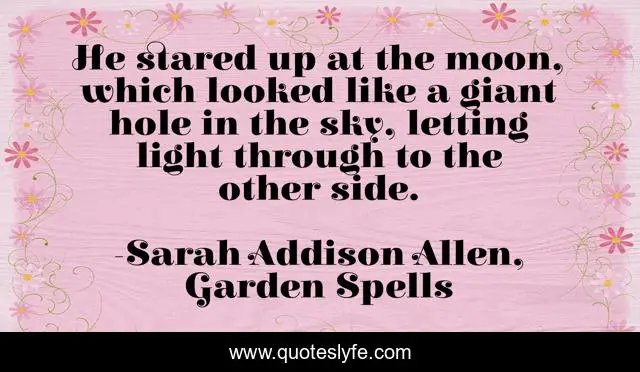 This page presents the quote "He stared up at the moon, which looked like a giant hole in the sky, letting light through to the other side.". Author of this quote is Sarah Addison Allen, Garden Spells. This quote is about garden, light, sky, moon, hole, spells,.