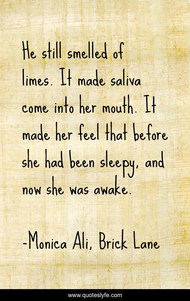 This page presents the quote "He still smelled of limes. It made saliva come into her mouth. It made her feel that before she had been sleepy, and now she was awake.". Author of this quote is Monica Ali, Brick Lane. .