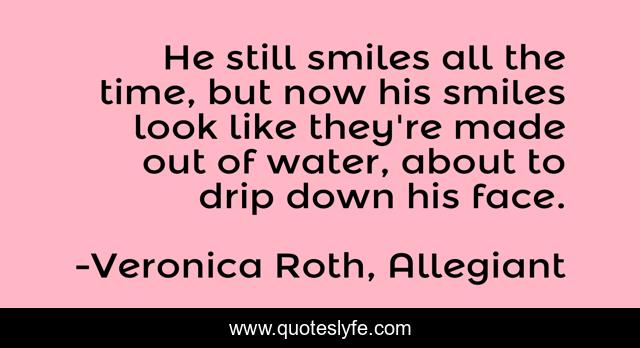 This page presents the quote "He still smiles all the time, but now his smiles look like they're made out of water, about to drip down his face.". Author of this quote is Veronica Roth, Allegiant. This quote is about smile, sadness, uriah, happiness,.