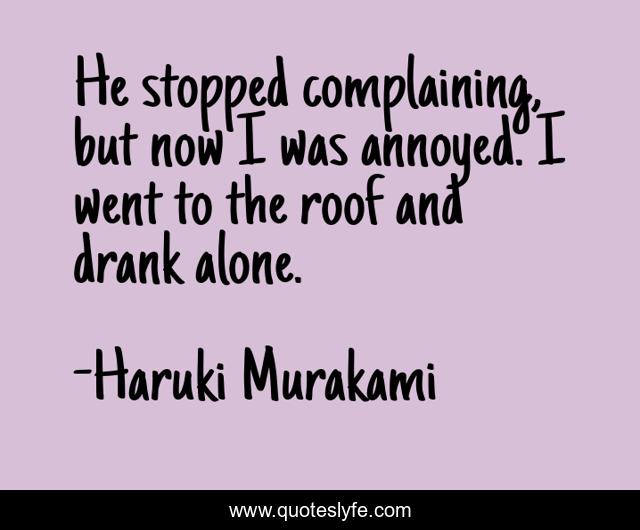 This page presents the quote "He stopped complaining, but now I was annoyed. I went to the roof and drank alone.". Author of this quote is Haruki Murakami. This quote is about lovers, love, sadness, love-story, drinking, affection,.