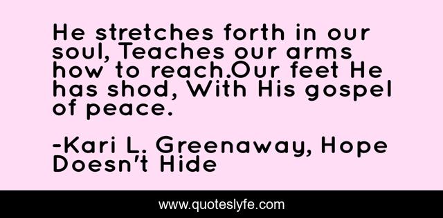 This page presents the quote "He stretches forth in our soul, Teaches our arms how to reach.Our feet He has shod, With His gospel of peace.". Author of this quote is Kari L. Greenaway, Hope Doesn't Hide. This quote is about peace, armor-of-god, ministry,.