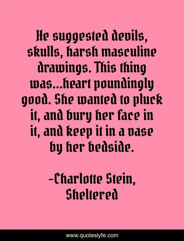 "Charlotte Stein, Sheltered Quotes." Quoteslyfe.com, 2025. Sun. 07 Dec. 2025. <https://www.quoteslyfe.com/quote/He-suggested-devils-skulls-harsh-masculine-drawings-18635>.