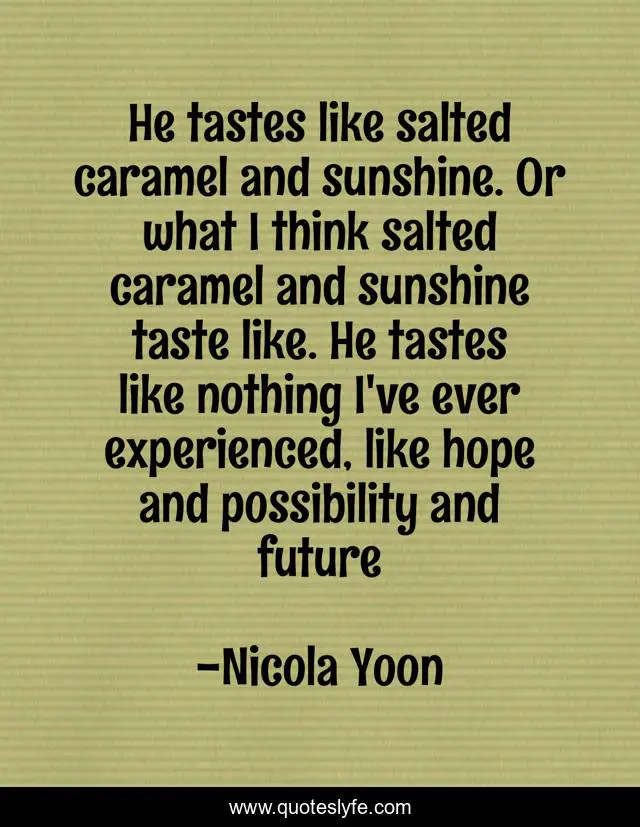 This page presents the quote "He tastes like salted caramel and sunshine. Or what I think salted caramel and sunshine taste like. He tastes like nothing I've ever experienced, like hope and possibility and future". Author of this quote is Nicola Yoon. .