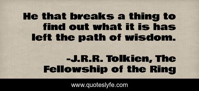 This page presents the quote "He that breaks a thing to find out what it is has left the path of wisdom.". Author of this quote is J.R.R. Tolkien, The Fellowship of the Ring. This quote is about reductionism, gandalf, foolishness, wisdom,.