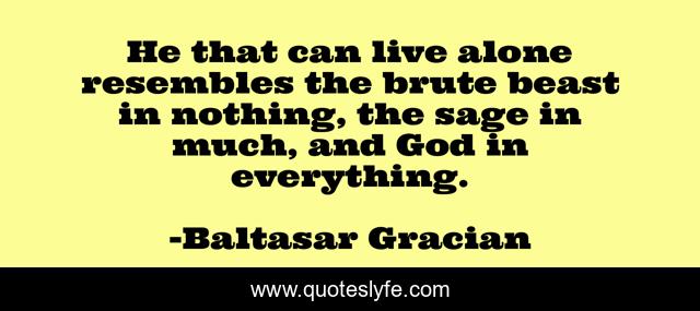 This page presents the quote "He that can live alone resembles the brute beast in nothing, the sage in much, and God in everything.". Author of this quote is Baltasar Gracian. This quote is about nothing, god, live,.