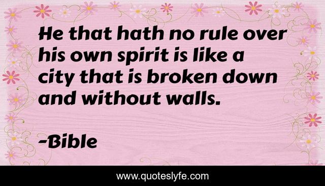 This page presents the quote "He that hath no rule over his own spirit is like a city that is broken down and without walls.". Author of this quote is Bible. This quote is about control, self,.