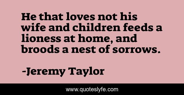 This page presents the quote "He that loves not his wife and children feeds a lioness at home, and broods a nest of sorrows.". Author of this quote is Jeremy Taylor. This quote is about home, children, wife,.