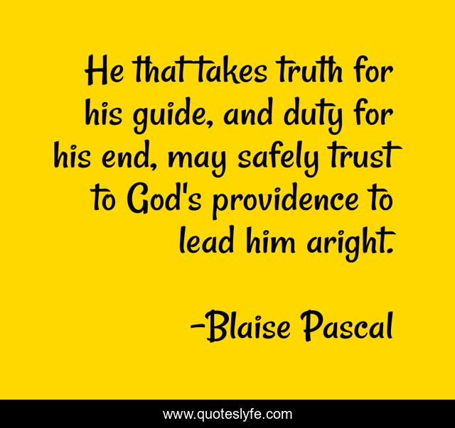 This page presents the quote "He that takes truth for his guide, and duty for his end, may safely trust to God's providence to lead him aright.". Author of this quote is Blaise Pascal. This quote is about god, end, truth,.