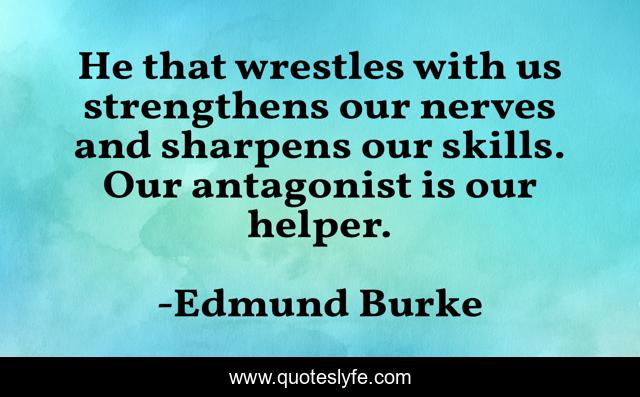 This page presents the quote "He that wrestles with us strengthens our nerves and sharpens our skills. Our antagonist is our helper.". Author of this quote is Edmund Burke. .