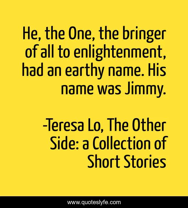 This page presents the quote "He, the One, the bringer of all to enlightenment, had an earthy name. His name was Jimmy.". Author of this quote is Teresa Lo, The Other Side: a Collection of Short Stories. This quote is about drug-use, delusions, enlightenment, hallucinations,.