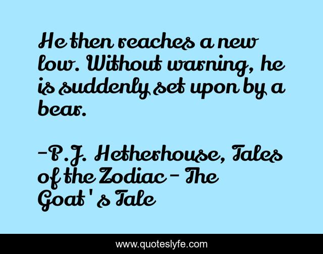 This page presents the quote "He then reaches a new low. Without warning, he is suddenly set upon by a bear.". Author of this quote is P.J. Hetherhouse, Tales of the Zodiac - The Goat's Tale. This quote is about humorous, astrology,.