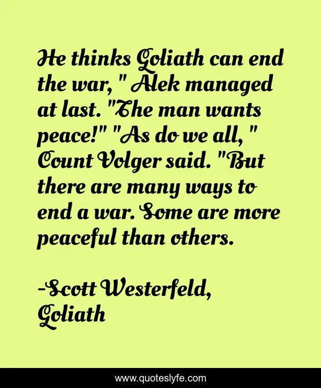 This page presents the quote "He thinks Goliath can end the war, " Alek managed at last. "The man wants peace!" "As do we all, " Count Volger said. "But there are many ways to end a war. Some are more peaceful than others.". Author of this quote is Scott Westerfeld, Goliath. This quote is about peace, war, goliath,.