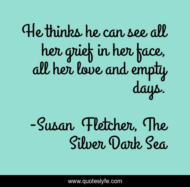 This page presents the quote "He thinks he can see all her grief in her face, all her love and empty days.". Author of this quote is Susan Fletcher, The Silver Dark Sea. This quote is about grief, love, affection,.