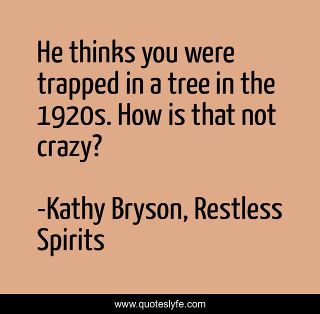 This page presents the quote "He thinks you were trapped in a tree in the 1920s. How is that not crazy?". Author of this quote is Kathy Bryson, Restless Spirits. This quote is about romantic-fantasy, ghosts, shakespeare, fairies-in-the-grass,.