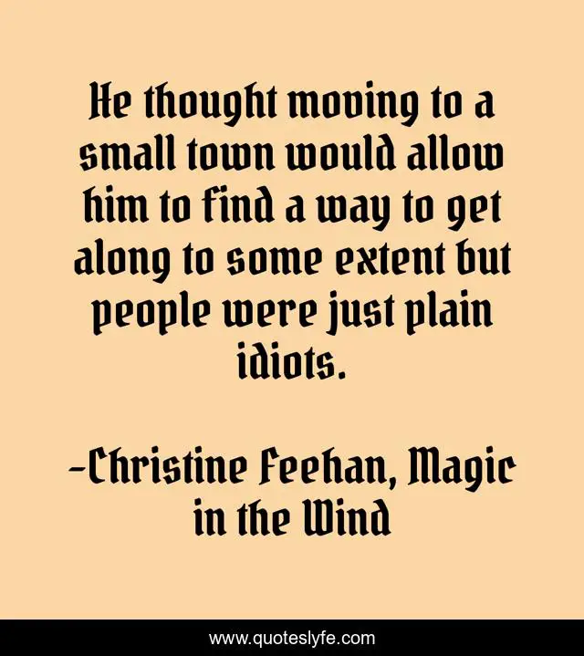 This page presents the quote "He thought moving to a small town would allow him to find a way to get along to some extent but people were just plain idiots.". Author of this quote is Christine Feehan, Magic in the Wind. This quote is about humorous, people-suck, small-town-life,.