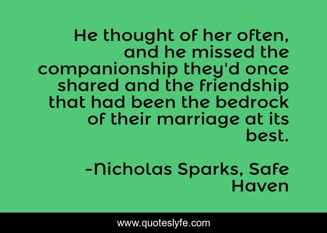 This page presents the quote "He thought of her often, and he missed the companionship they'd once shared and the friendship that had been the bedrock of their marriage at its best.". Author of this quote is Nicholas Sparks, Safe Haven. This quote is about friendship, love, life-lessons, affection,.