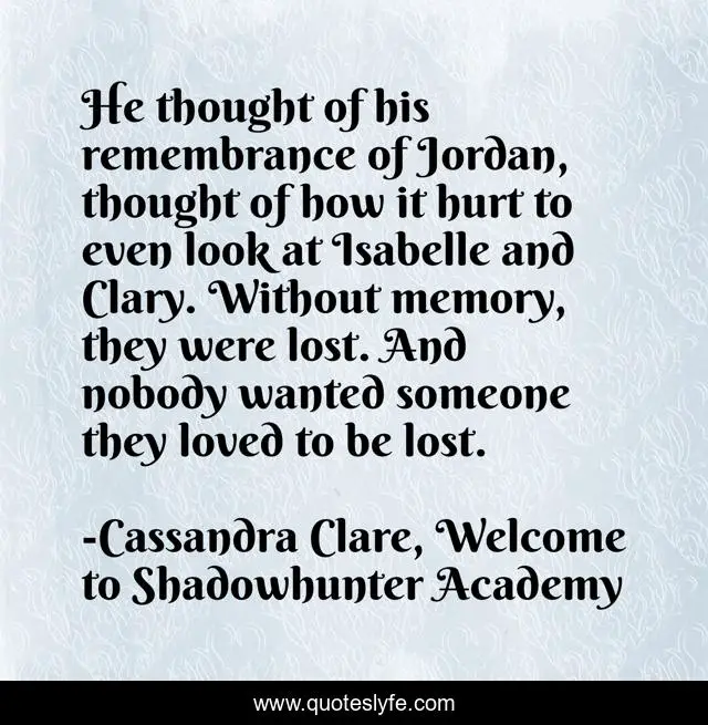 This page presents the quote "He thought of his remembrance of Jordan, thought of how it hurt to even look at Isabelle and Clary. Without memory, they were lost. And nobody wanted someone they loved to be lost.". Author of this quote is Cassandra Clare, Welcome to Shadowhunter Academy. This quote is about love, clary-fray, isabelle-lightwood, jordan-kyle, memory, simon-lewis, affection,.