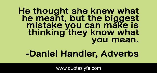 This page presents the quote "He thought she knew what he meant, but the biggest mistake you can make is thinking they know what you mean.". Author of this quote is Daniel Handler, Adverbs. This quote is about relationships, adverbs, love, affection,.