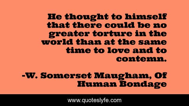 This page presents the quote "He thought to himself that there could be no greater torture in the world than at the same time to love and to contemn.". Author of this quote is W. Somerset Maugham, Of Human Bondage. This quote is about hate, love, affection,.
