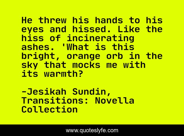 This page presents the quote "He threw his hands to his eyes and hissed. Like the hiss of incinerating ashes. 'What is this bright, orange orb in the sky that mocks me with its warmth?". Author of this quote is Jesikah Sundin, Transitions: Novella Collection. This quote is about mackayla-lane, humor, the-biodome-chronicles, light, sky, ashes, jesikah-sundin, sun, transitions,.