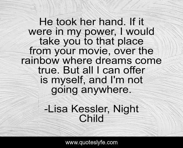 This page presents the quote "He took her hand. If it were in my power, I would take you to that place from your movie, over the rainbow where dreams come true. But all I can offer is myself, and I'm not going anywhere.". Author of this quote is Lisa Kessler, Night Child. This quote is about romance, mythology, paranormal-romance, nightwalkers,.