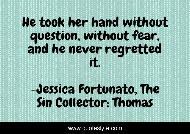 This page presents the quote "He took her hand without question, without fear, and he never regretted it.". Author of this quote is Jessica Fortunato, The Sin Collector: Thomas. This quote is about friendship, love, regret, affection,.
