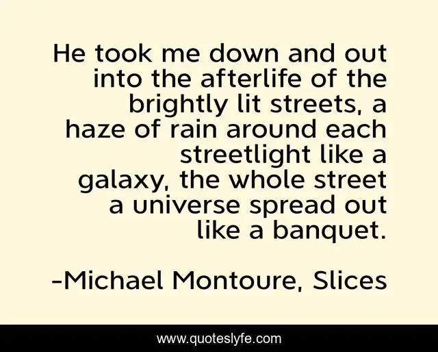 This page presents the quote "He took me down and out into the afterlife of the brightly lit streets, a haze of rain around each streetlight like a galaxy, the whole street a universe spread out like a banquet.". Author of this quote is Michael Montoure, Slices. This quote is about urban, pretty-prose, rain,.