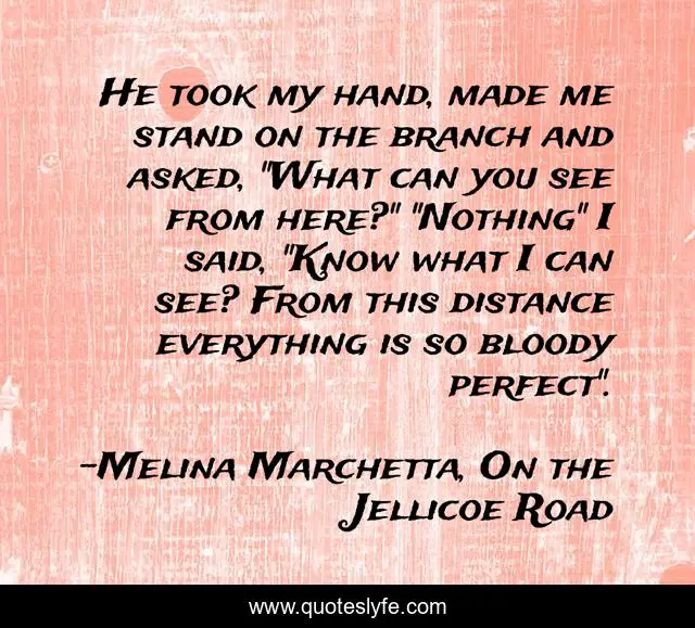 This page presents the quote "He took my hand, made me stand on the branch and asked, "What can you see from here?" "Nothing" I said, "Know what I can see? From this distance everything is so bloody perfect".". Author of this quote is Melina Marchetta, On the Jellicoe Road. .