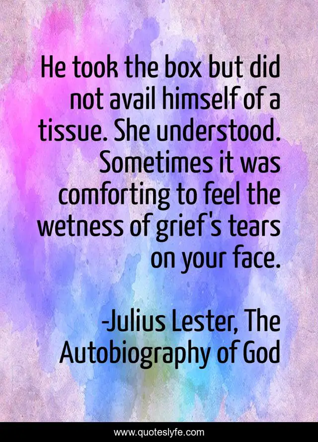This page presents the quote "He took the box but did not avail himself of a tissue. She understood. Sometimes it was comforting to feel the wetness of grief's tears on your face.". Author of this quote is Julius Lester, The Autobiography of God. This quote is about grief, tears,.