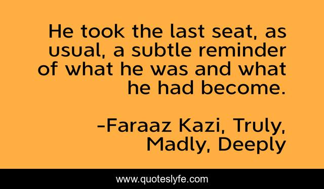 This page presents the quote "He took the last seat, as usual, a subtle reminder of what he was and what he had become.". Author of this quote is Faraaz Kazi, Truly, Madly, Deeply. This quote is about past, love, present, affection,.