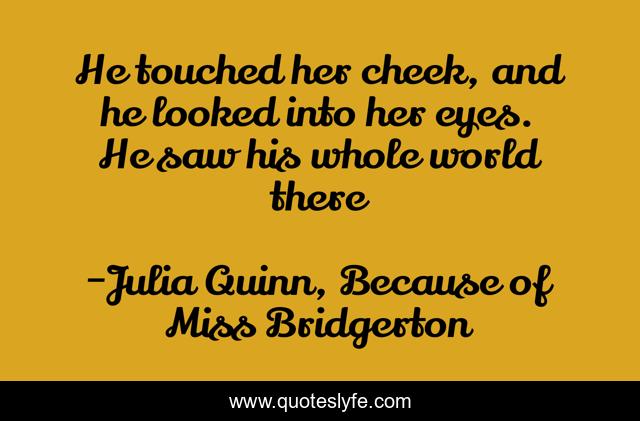 This page presents the quote "He touched her cheek, and he looked into her eyes. He saw his whole world there". Author of this quote is Julia Quinn, Because of Miss Bridgerton. This quote is about world, eyes, cheek, love, affection,.