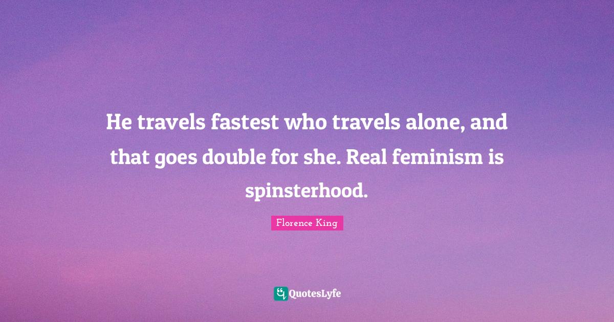 This page presents the quote "He travels fastest who travels alone, and that goes double for she. Real feminism is spinsterhood.". Author of this quote is Florence King. This quote is about double standard, real, spinsterhood, feminism,.