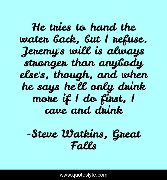 This page presents the quote "He tries to hand the water back, but I refuse. Jeremy's will is always stronger than anybody else's, though, and when he says he'll only drink more if I do first, I cave and drink". Author of this quote is Steve Watkins, Great Falls. .
