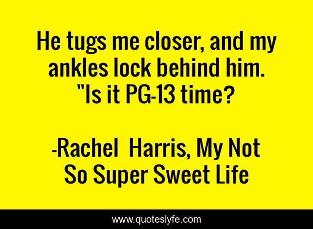 This page presents the quote "He tugs me closer, and my ankles lock behind him. "Is it PG-13 time?". Author of this quote is Rachel Harris, My Not So Super Sweet Life. This quote is about romance, ya, young-adult-romance,.